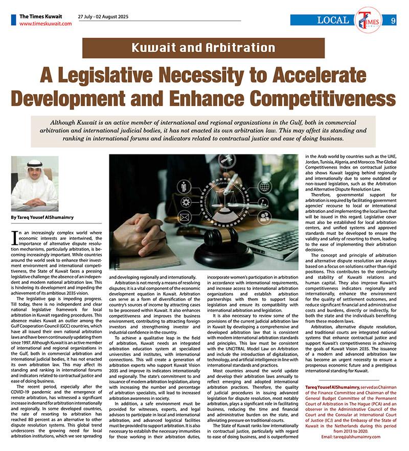 In an increasingly complex world where economic interests are intertwined, the importance of alternative dispute resolution mechanisms, particularly arbitration, is becoming increasingly important. While countries around the world seek to enhance their investment environment and international competitiveness, the State of Kuwait faces a pressing legislative challenge: the absence of an independent and modern national arbitration law. This is hindering its development and impeding the achievement of its ambitious 2035 vision.
