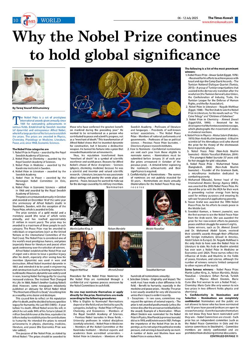 The prize consists of a gold medal and a monetary award (the value of which varies annually, and has reached approximately $1 million in recent years). The prize may be awarded to a maximum of three people in each category. The Peace Prize may be awarded to individuals or organizations (such as the United Nations or the International Committee of the Red Cross). The Nobel Prize is considered one of the world’s most prestigious honors, and prizes (especially those for literature and peace) often spark controversy over the selection of winners.
